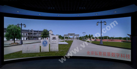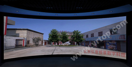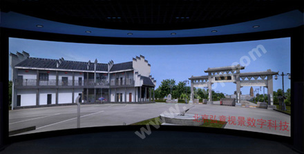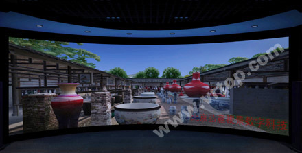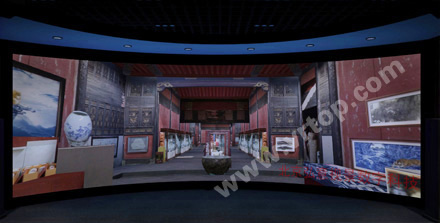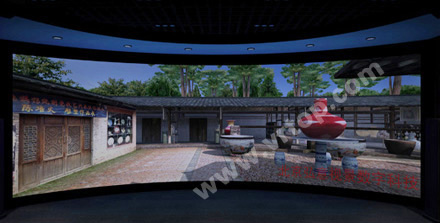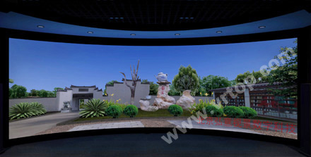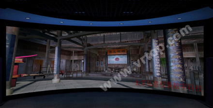 演示廳主要設(shè)備由六個投影機三個通道、圖像融合機、三通道環(huán)幕、電腦、音響等組成,通過投影機照射在金屬環(huán)形屏幕上,通過弘意視景制作三維虛擬旅游系統(tǒng),可以看三維立體環(huán)幕導(dǎo)游影片。